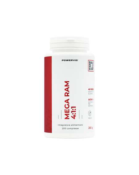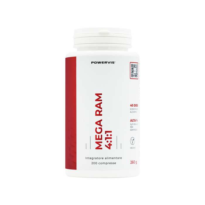 Mega Ram 4:1:1 è un integratore a base di aminoacidi ramificati in compresse da 1g di Bcaa nel rapporto 4:1:1 (leucina, isoleucina e valina).
