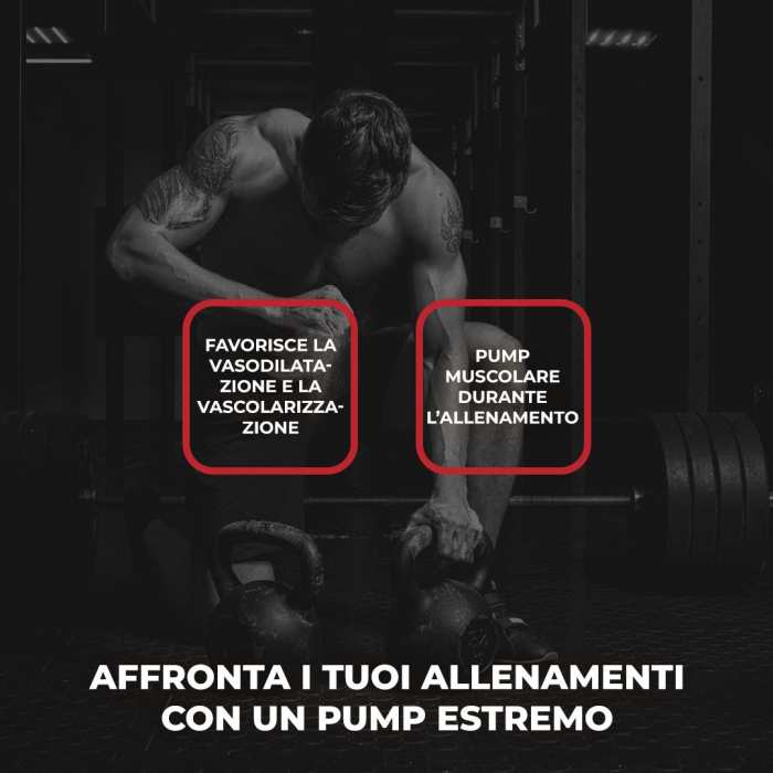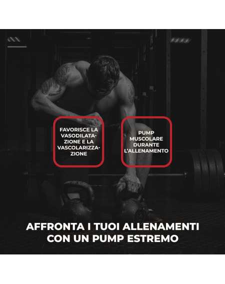 • Supporta l'aumento dei livelli di Arginina nel corpo, contribuendo alla sintesi dell'ossido nitrico. Questo induce ad un effetto vasodilatatorio, che garantisce un miglior apporto di ossigeno e nutrienti ai tessuti muscolari, favorendo il pump muscolare durante l'allenamento.