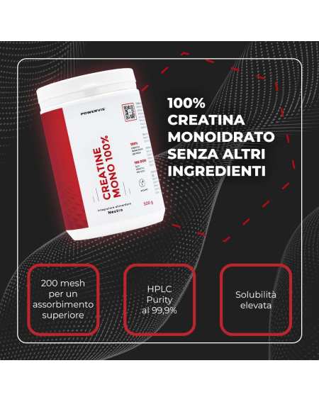 Creatine Mono 100% è un integratore alimentare in polvere a base di Creatina Monoidrato pura al 100%, senza l'aggiunta di altri ingredienti.