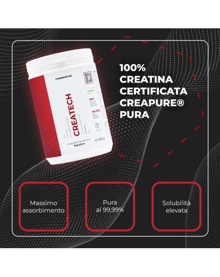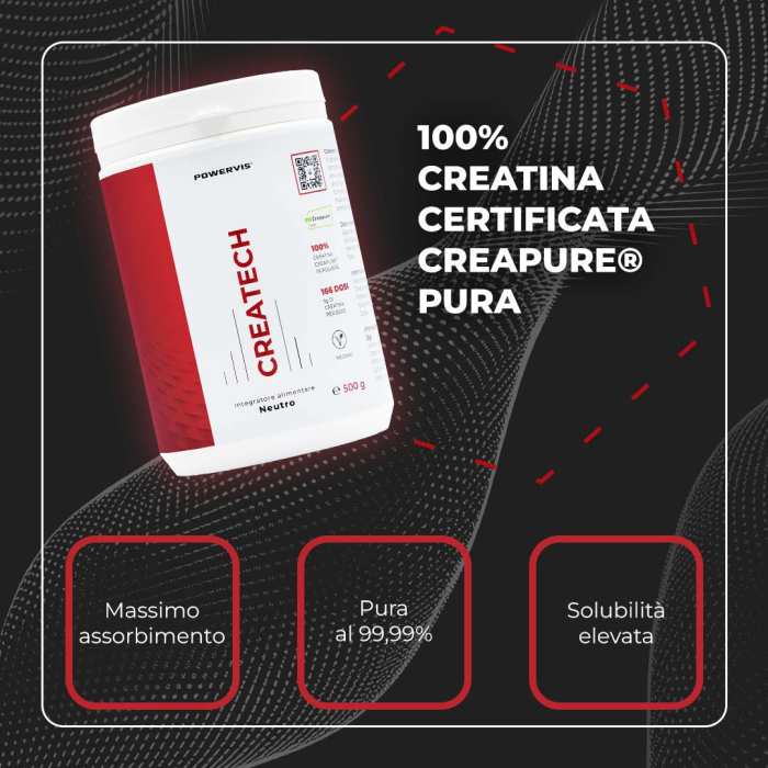 Createch è un integratore alimentare in polvere a base di Creatina Creapure®, considerata in tutto il mondo la creatina monoidrato di migliore qualità disponibile sul mercato.
