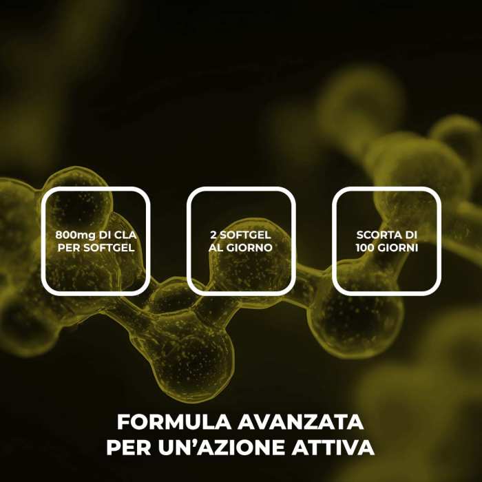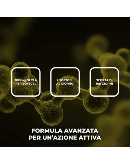 Per garantire un'azione attiva ed efficace, abbiamo realizzato una formula avanzata con 800mg di Acido Linoleico Coniugato per softgel. In questo modo è sufficiente assumere solo 2 softgel al giorno per garantire tutti i benefici apportati dal CLA, in modo pratico e completo.