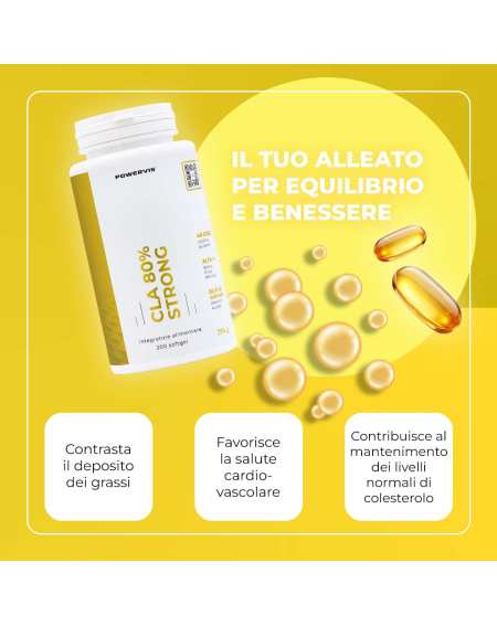 CLA 80% Strong è un integratore alimentare in softgel a base di CLA (acido linoleico coniugato) titolato al 80%.