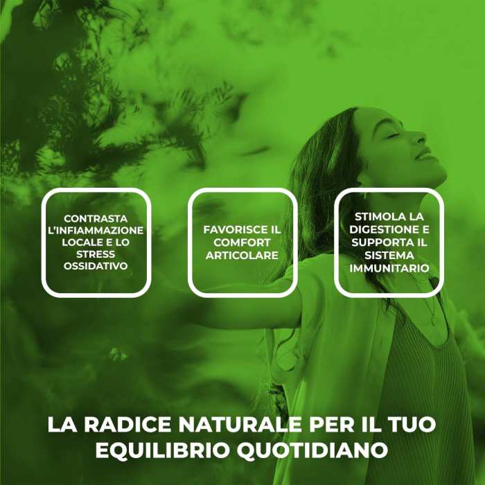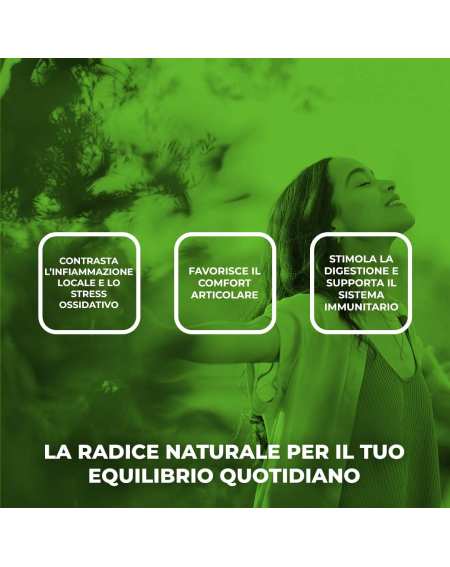 - Curcuma: ricca di curcuminoidi dall’azione antiossidante, contribuisce al supporto delle naturali difese dell’organismo, modulando la risposta infiammatoria fisiologica, e favorisce il benessere articolare.