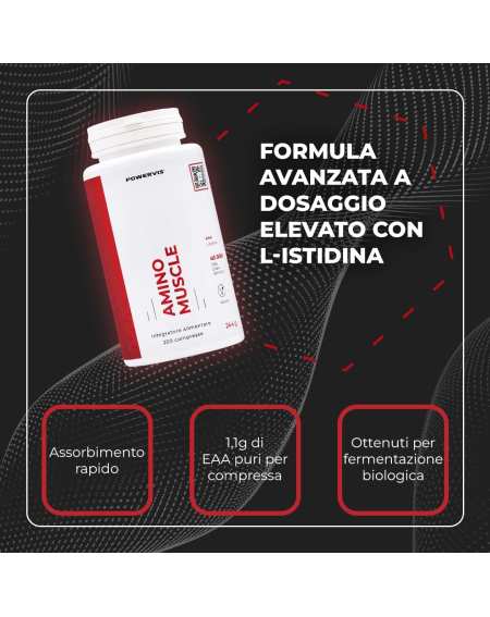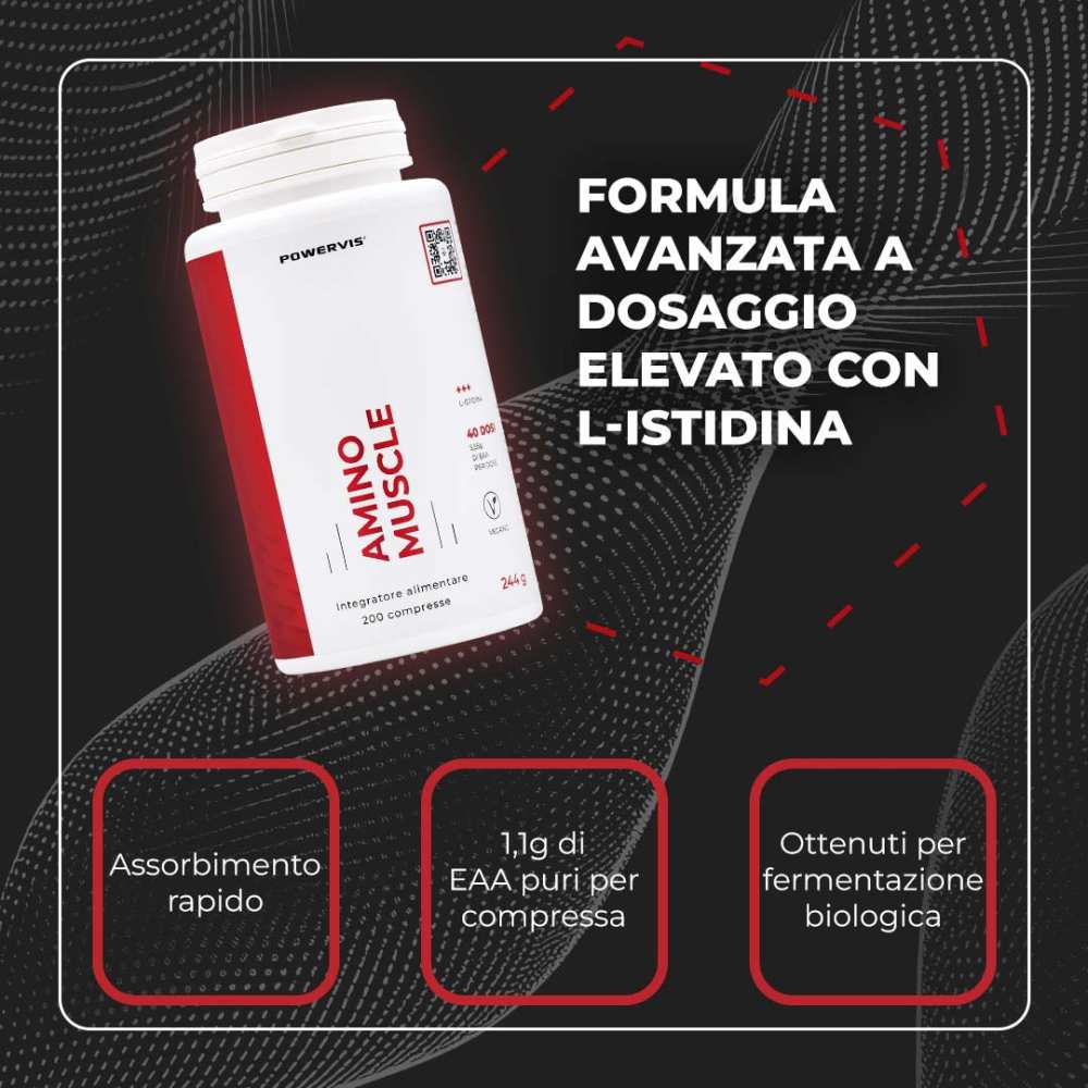 Amino Muscle è stato realizzato con una formulazione ad alto dosaggio con 1,110g di Eaa per compressa, in modo da favorire un'azione attiva, ed è arricchito con L-Istidina per supportare al meglio il recupero muscolare.