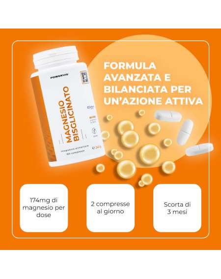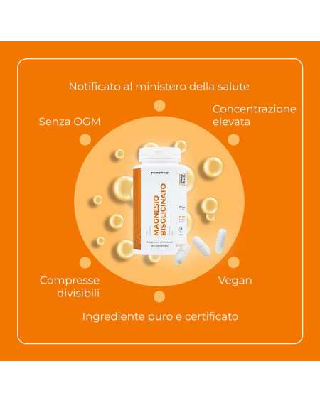 Per garantire un'azione attiva del principio attivo, abbiamo realizzato Magnesio Bisglicinato con una formulazione ad alto dosaggio, in modo da fornire al nostro corpo un apporto ottimale di questo minerale con 2 compresse al giorno.