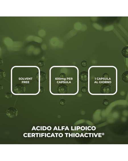 Acido Alfa Lipoico è un integratore alimentare in capsule vegetali da 600mg di Acido Alfa Lipoico (ALA) certificato ThioActive®.